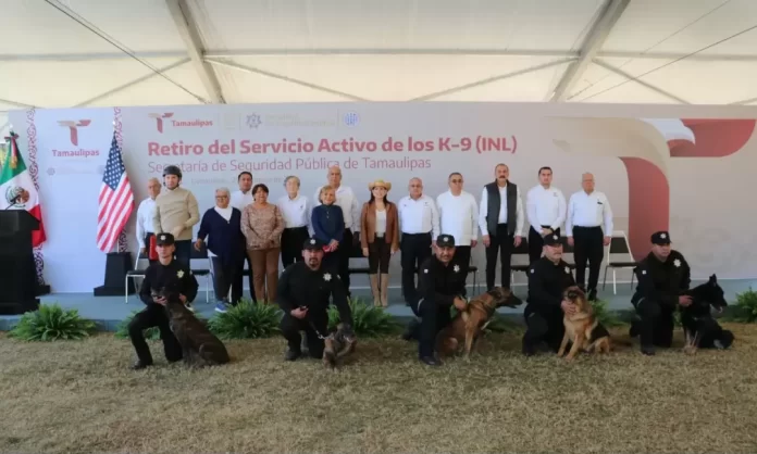 Ciudad Victoria, Tamaulipas.- Con una ceremonia de honores, la Secretaría de Seguridad Pública de Tamaulipas (SSPT) despidió a cinco agentes caninos de múltiples especialidades retirados del servicio activo, los cuales fueron adoptados por sus manejadores.