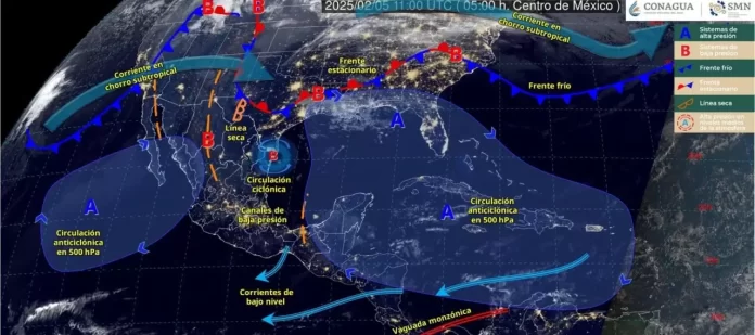Por otra parte, una circulación anticiclónica en niveles medios de la atmósfera mantendrá ambiente caluroso en estados del litoral del Pacífico y zonas de la Mesa del Norte y la Mesa Central.