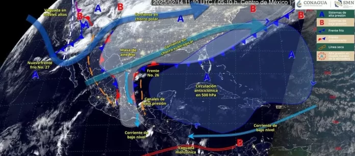 Por otro lado, el nuevo frente frío número 27 ingresará al noroeste de México, en interacción con una vaguada polar y con la corriente en chorro polar, generarán lluvias y chubascos, además de fuertes rachas de viento en el noroeste y norte del país, así como la posible caída de nieve o aguanieve en las sierras de Baja California.