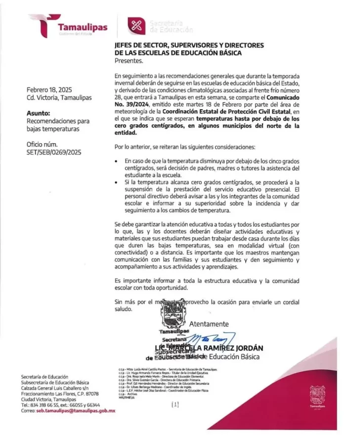 CIUDAD VICTORIA.- La Secretaría de Educación de Tamaulipas informó que derivado de las condiciones climatológicas asociadas al frente frío número 28, habrá suspensión de clases en aquellos municipios donde la temperatura baje de los cero grados Centígrados.