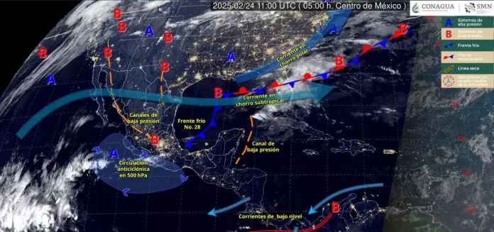 CIUDAD VICTORIA. – Para hoy, el frente frío número 28 se extenderá sobre el sur del Golfo de México y la Península de Yucatán, y originará lluvias puntuales torrenciales en Veracruz, Tabasco y Chiapas, lluvias puntuales intensas en Oaxaca y lluvias puntuales muy fuertes en Campeche, Yucatán y Quintana Roo, informó el Servicio Meteorológico Nacional.