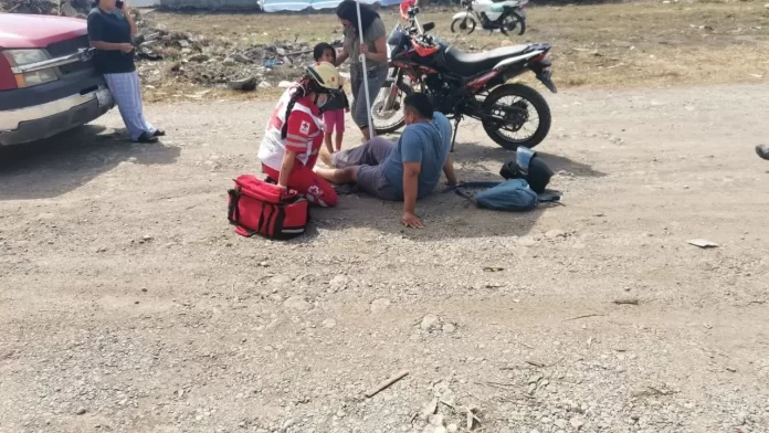 Con probable fractura en la pierna izquierda resultó un motociclista después de derrapar y caer al suelo cuando circulaba por la Avenida Las Torres a la altura del Fraccionamiento Valle del Magisterio.