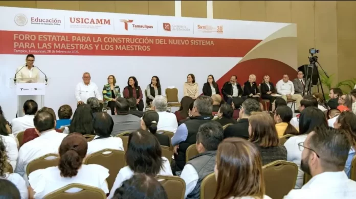 Tampico, Tamaulipas.- En el marco del Foro Estatal para la Construcción del Nuevo Sistema para las Maestras y los Maestros realizado en el municipio de Tampico, el coordinador de asuntos jurídicos de la USICAMM del Gobierno Federal, Miguel Ángel Guerrero López, reafirmó el compromiso de la presidenta de México, Claudia Sheinbaum Pardo con las maestras y maestros de México y de Tamaulipas.