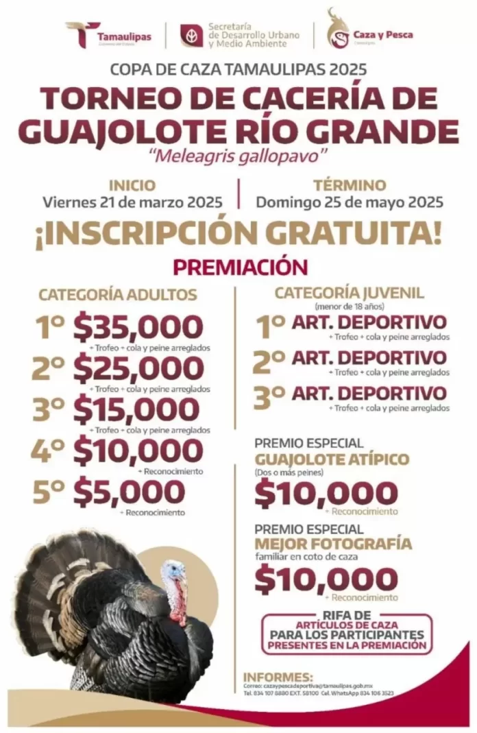 Ciudad Victoria, Tamaulipas.- Continuando con las acciones para impulsar el turismo cinegético en Tamaulipas, la Comisión de Caza y Pesca Deportiva, lanzó la convocatoria a cazadores locales, nacionales y extranjeros a participar en la Copa de Caza Tamaulipas 2025, un torneo dedicado a la cacería del Guajolote Río Grande (Meleagris gallopavo Tamaulipas).