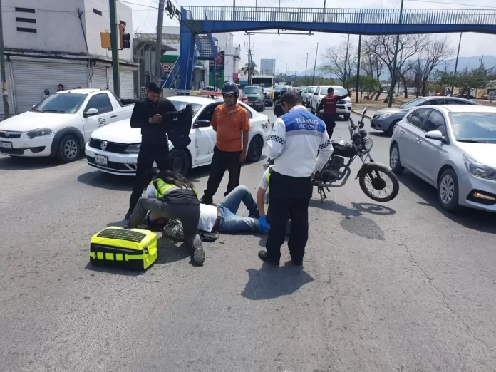 Cd. Victoria, Tam.- Tirado en el suelo y doliéndose de golpes en la mayor parte del cuerpo, quedó un motociclista luego de impactarse en la parte lateral de una camioneta conducida por un empleado.