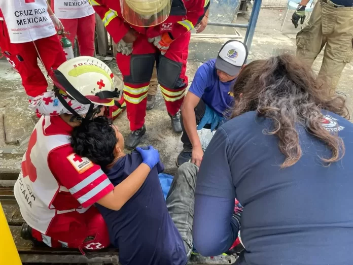 Por varios minutos los rescatistas trabajaron para poder liberarle la pierna izquierda al trabajador quien por accidente quedó atrapado en la banda de traslado.
