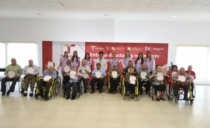 Ciudad Victoria, Tamaulipas.- Como parte de la estrategia impulsada por el gobernador del Estado, Américo Villarreal Anaya, y fortalecida por el compromiso de la presidenta del Sistema DIF Tamaulipas, doctora María Santiago de Villarreal, para asegurar que todas y todos los tamaulipecos cuenten con documentos de identidad que respalden sus derechos, el DIF estatal llevó a cabo la entrega de actas de nacimiento a adultos mayores en la Casa Hogar del Adulto Mayor.