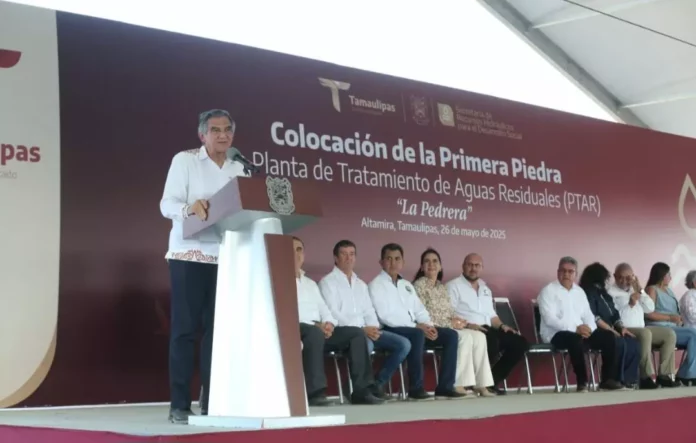 Altamira, Tamaulipas. – Tamaulipas es el segundo estado a nivel nacional con mayor inversión para el manejo sustentable del agua, afirmó el gobernador Américo Villarreal Anaya, al poner la primera piedra de la Planta Tratadora de Aguas Residuales (PTAR) «La Pedrera», en el municipio de Altamira.