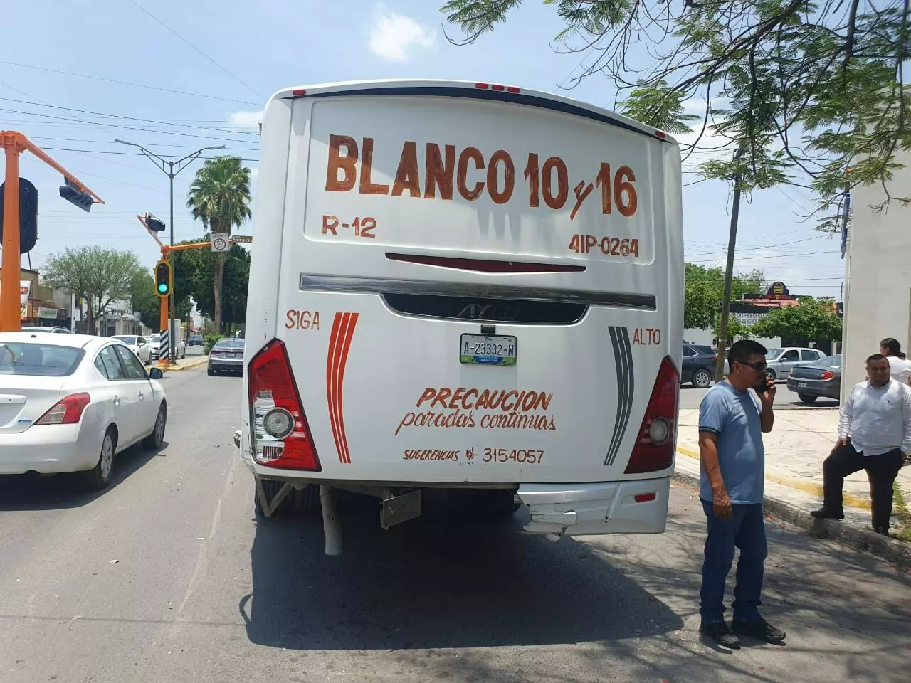 Aparentemente a la altura de la calle Veracruz el conductor no se percató que unidad de transporte público estaba detenida y aunque quiso esquivarlo no lo consiguió y acabó por arrancarle parte de la polvera puerta y trasera al carro.