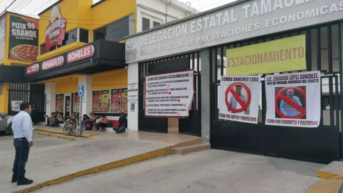 CIUDAD VICTORIA.- Esta mañana, el Frente Estatal de la Defensa de la Seguridad Social en el Estado de Tamaulipas tomó la Subdelegación de Prestaciones Económicas del Issste y exigió la destitución del subdelegado Tomás Sánchez Lara y del jefe de la Unidad Jurídica Eduardo López González.