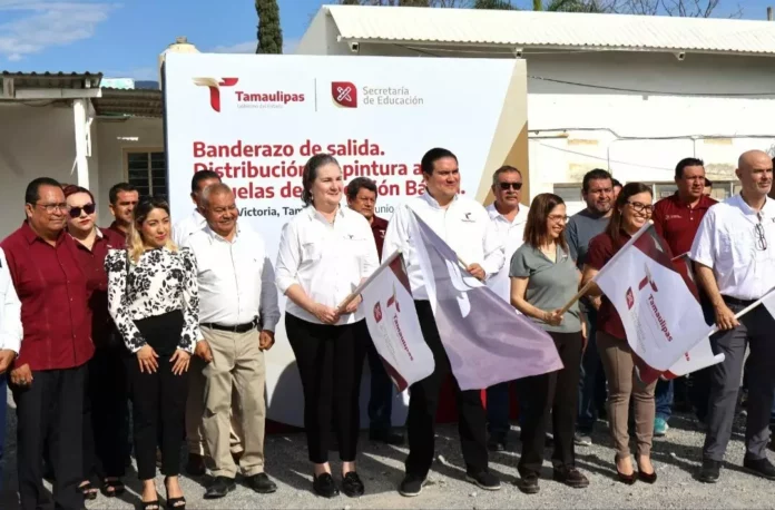 Ciudad Victoria, Tamaulipas.– En representación de Miguel Ángel Valdez García, secretario de Educación de Tamaulipas, Hugo Armando Fonseca Reyes, subsecretario de Administración, en compañía de las titulares de las subsecretarías de Educación Básica y Planeación, Marcela Ramírez Jordán y Silvia Martínez Guerra, respectivamente, dio el banderazo de salida para una nueva entrega de material para el mantenimiento de escuelas de educación básica en la entidad.