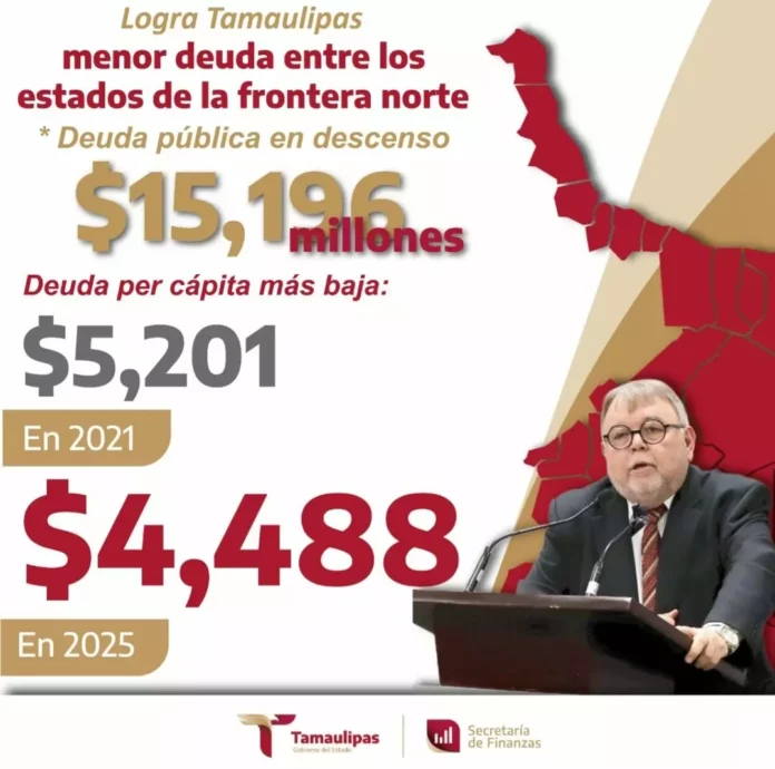 De acuerdo con los reportes del Centro de Estudios de las Finanzas Públicas (CEFP) de la Cámara de Diputados, publicados en junio, y con base en cifras de la Secretaría de Hacienda y Crédito Público (SHCP), al primer trimestre de 2025, la deuda pública de Tamaulipas ascendió a 15,196 millones de pesos, cifra considerablemente inferior a la registrada en otras entidades fronterizas como Baja California (21,832 millones), Sonora (24,998 millones), Coahuila (38,420 millones), Chihuahua (52,065 millones) y Nuevo León (72,833 millones).