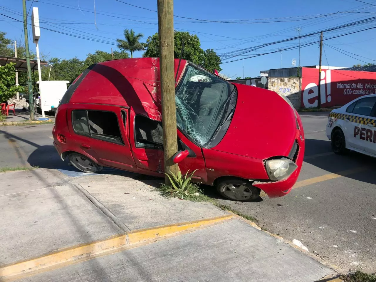 Tras ser impactado por un costado, el automóvil Clio fue arrastrado por el automóvil Corolla hasta terminar su trayectoria al prensarlo contra un poste de madera, lo que salvó al Clio de quedar completamente volcado.