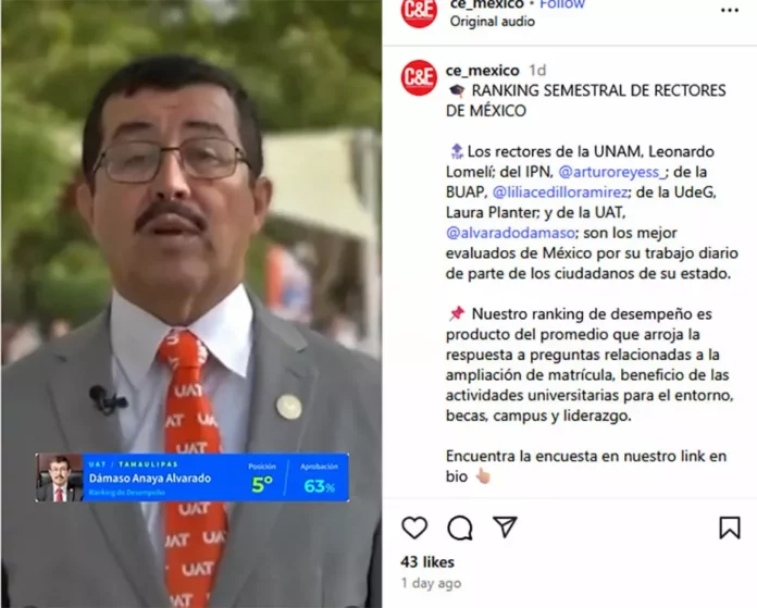El rector de la Universidad Autónoma de Tamaulipas (UAT), Dámaso Anaya, fue de los mejor evaluados de México por su trabajo diario de parte de los ciudadanos de su estado.