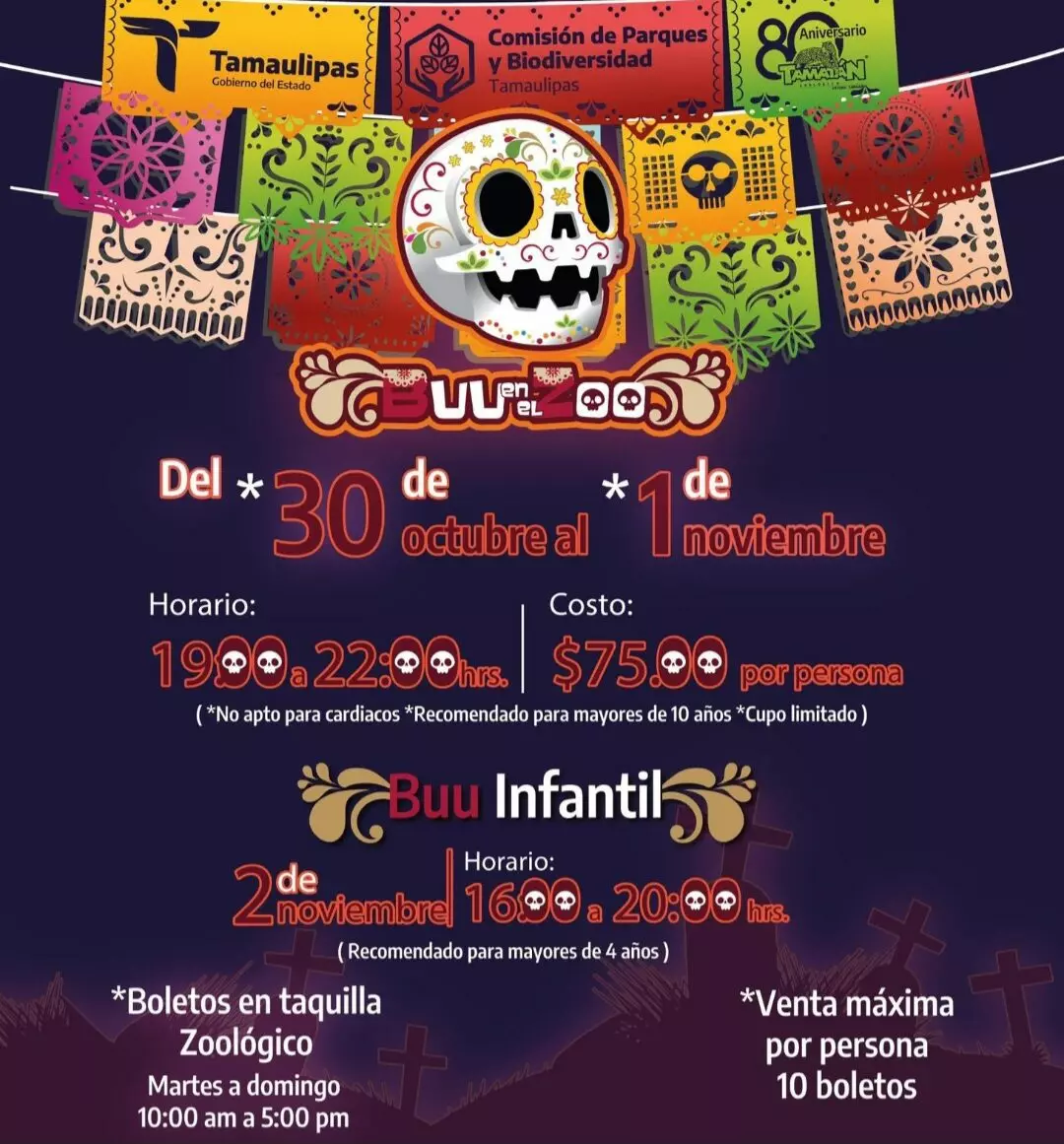 Ciudad Victoria, Tamaulipas.- La Comisión de Parques y Biodiversidad de Tamaulipas, invita a las familias a vivir la magia del Día de Muertos con el espectacular “Buu en el Zoo”, que tras el éxito de ediciones pasadas, regresa con mayor emoción en cuatro fechas, para llenarte de sorpresas y tradiciones en un ambiente único.