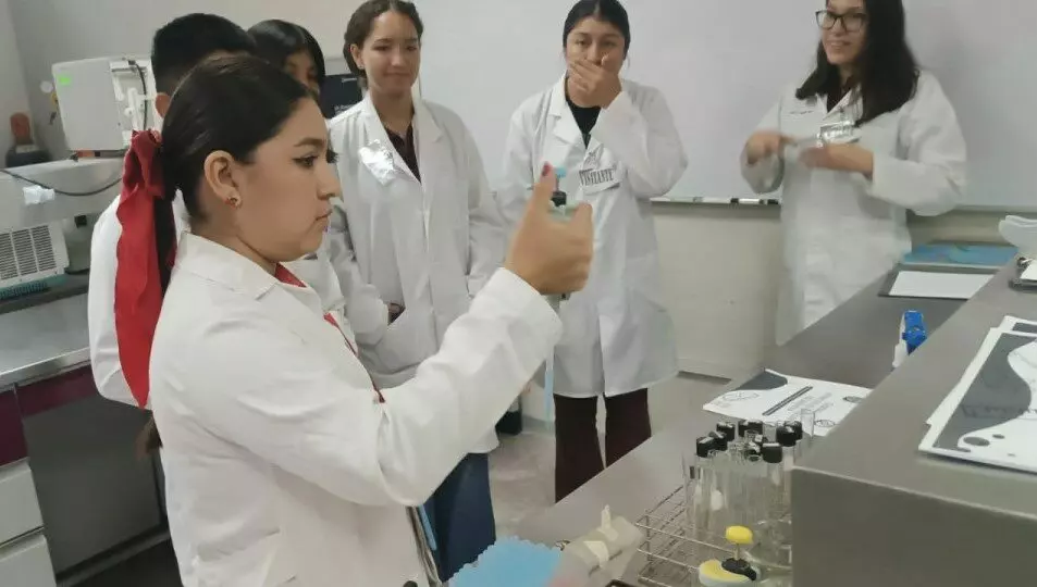 Compartió que las y los jóvenes tuvieron la oportunidad de ingresar a los laboratorios de química del CBG, donde participaron activamente en prácticas relacionadas con la seguridad e higiene en el laboratorio, la preparación de soluciones químicas, evaluaciones de pH y la observación de diversas muestras biológicas mediante microscopios de alta tecnología.