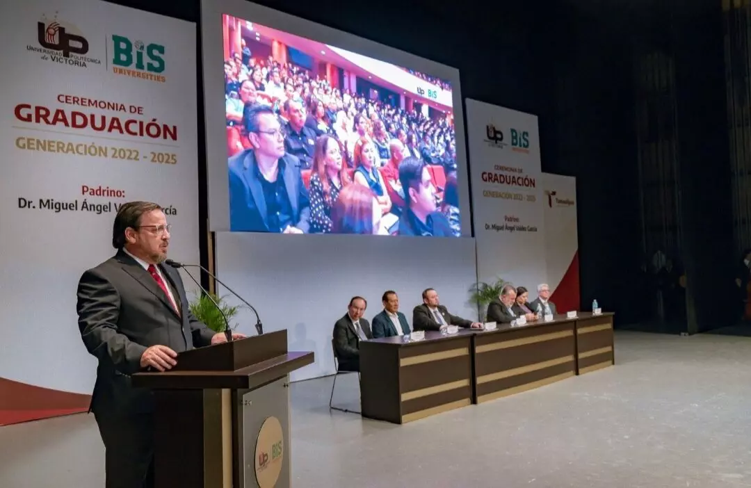 Ciudad Victoria, Tamaulipas.– Poner al servicio de la sociedad sus conocimientos, capacidades y talentos desarrollados durante su formación profesional, fue el llamado que hizo Miguel Ángel Valdez García, secretario de Educación de Tamaulipas, a las y los graduados de las diferentes carreras que conforman la Generación 2022–2025 de la Universidad Politécnica de Victoria (UPV), de la cual fue padrino.