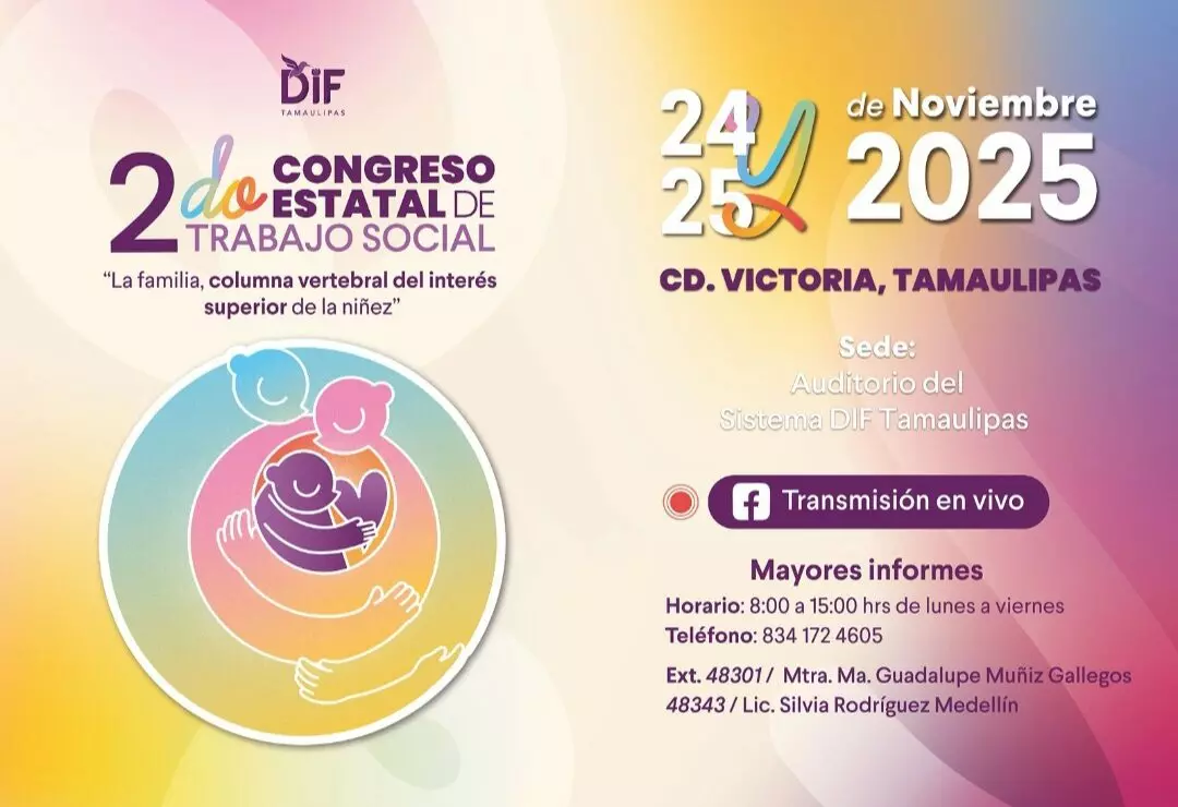 El evento es convocado por la Procuraduría de Protección a Niñas, Niños, Adolescentes y Familia del DIF Estatal y será transmitido en vivo por la página oficial de Facebook del Sistema DIF Tamaulipas, a partir de las 9:00 horas, ambos días.