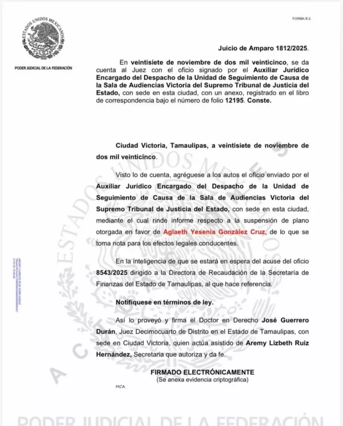 CIUDAD VICTORIA.- Por orden de un juez federal, la multa de un millón 390 mil 400 pesos impuesta a la abogada Aglaeth Yesenia González Cruz quedó suspendida.