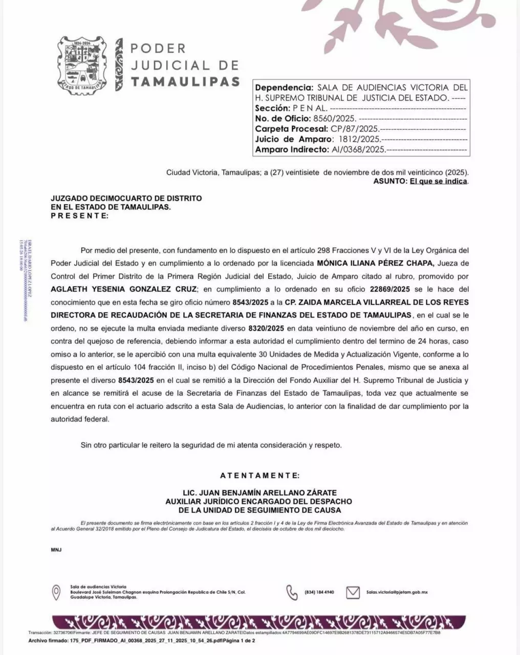 En cumplimiento con lo ordenado en el Juicio de Amparo 22869/2025, se giró el oficio 8543/2025 a la Secretaría de Finanzas del Estado de Tamaulipas para que no se ejecute la sanción.