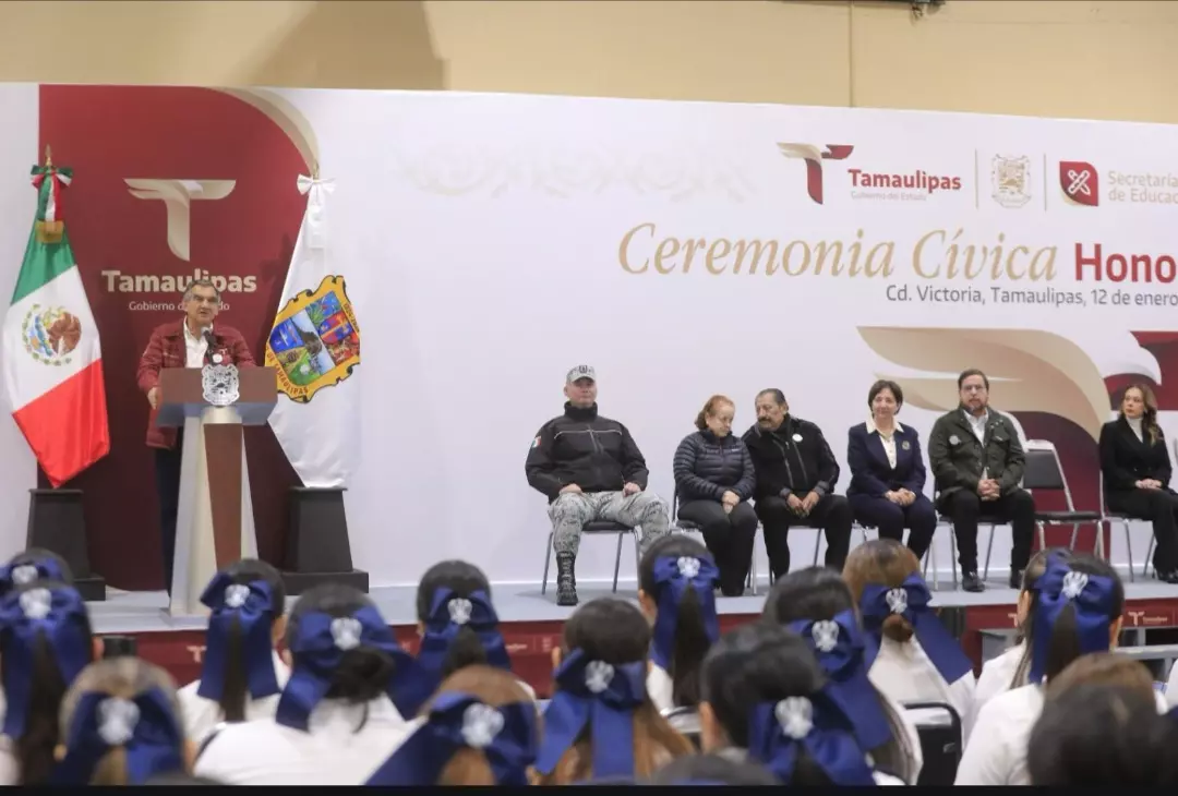 Ciudad Victoria, Tamaulipas.– El gobernador de Tamaulipas, Américo Villarreal Anaya resaltó el papel trascendental de la educación y del magisterio en la formación de una sociedad más humana, justa y con visión de futuro, al presidir la Ceremonia de Honores a la Bandera en la Benemérita Escuela Normal Federalizada de Tamaulipas.