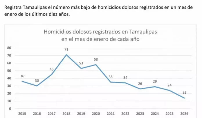 Ciudad Victoria, Tamaulipas. – En Tamaulipas se registraron 14 homicidios dolosos en enero de 2026, siendo la cifra más baja para este mes en los últimos diez años, además de representar una disminución anual del 46.2 por ciento en el promedio diario de este delito, respecto a enero de 2025, destacando como una de las entidades con mejores indicadores a nivel nacional, como resultado de la estrategia de seguridad desde el inicio del gobierno de Américo Villarreal.