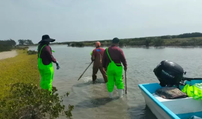 Aldama, Tamaulipas. – Con el objetivo de dar seguimiento y fortalecer el desarrollo de los proyectos de granjas de ostión en los municipios de Aldama y San Fernando, personal técnico de la Subsecretaría de Pesca y Acuacultura, encabezada por el subsecretario Jorge de Jesús Montagner Mendoza, realizó visitas de trabajo en la Barra de San Vicente y en el poblado de Carbonera Norte.