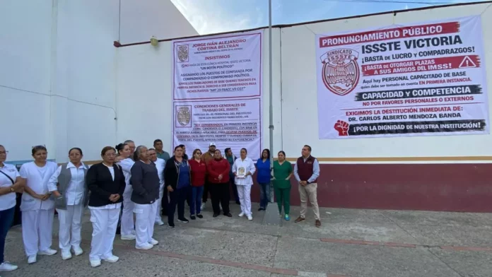CIUDAD VICTORIA.- Para denunciar favoritismo en la asignación de bases de trabajo, así como diversas irregularidades como carencia de medicamentos y suministros básicos para atender a los derechohabientes, la base trabajadora del Issste en esta Ciudad Capital se manifestó esta mañana afuera de la Clínica Hospital.