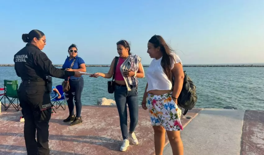 Ciudad Madero, Tamaulipas.- Ante el aumento de vacacionistas en la Playa Miramar, personal de la Guardia Estatal de Género implementó una campaña para prevenir la violencia entre las familias visitantes.