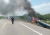 Tráiler vuelca y se incendia, chofer esta grave