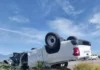Chofer causa choque con volcadura, lesiona a su pasajera